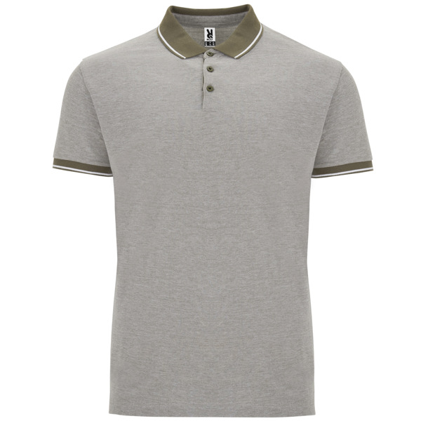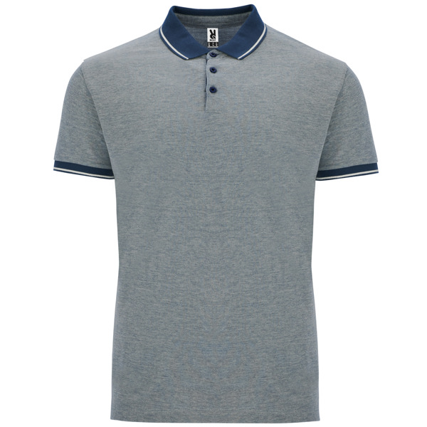 Polo chiné manches courtes. Col en couleur unie avec côte 1×1 et détails décoratif contrastés. Patte de boutonnage contrastée avec 3 boutons. Bord de manches en côte avec détaille contrastés. Bas avec ouverture latérale renforcée et bande décorative. Empiècement du dos légèrement plus long que le devant du polo.