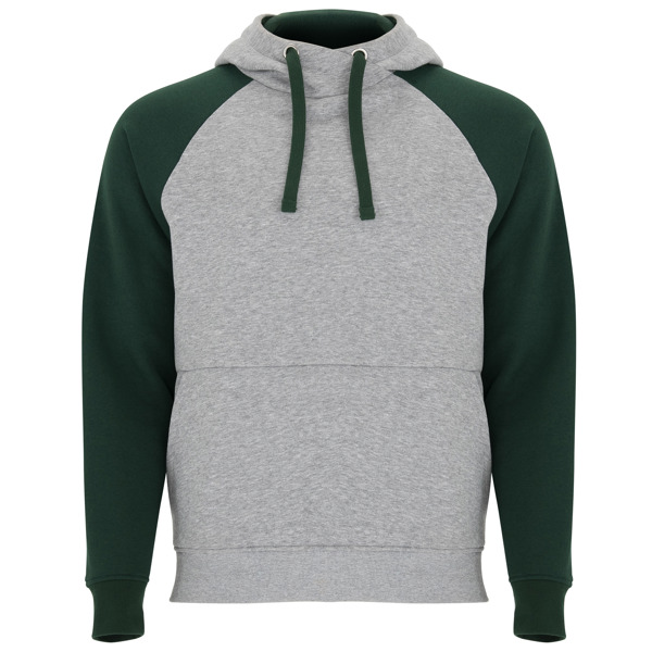 Sweat-shirt bi couleur unisexe. Capuche avec col croisé et oeillets métallique, intérieur et cordons contrastés. Manches raglan contrastées. Poche kangourou. Poignets et bas en côte avec élasthanne 1×1.